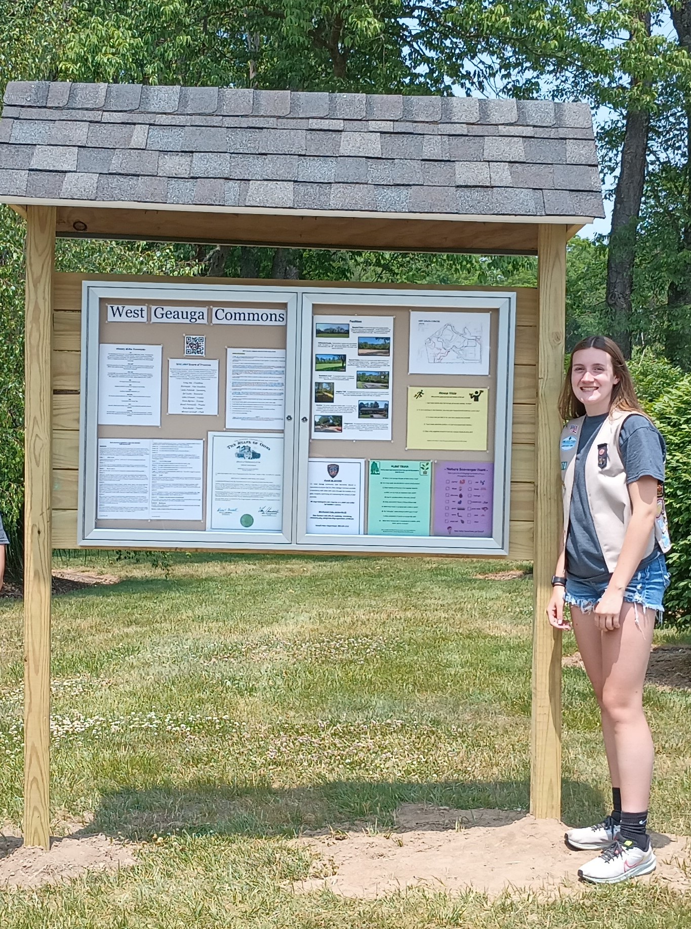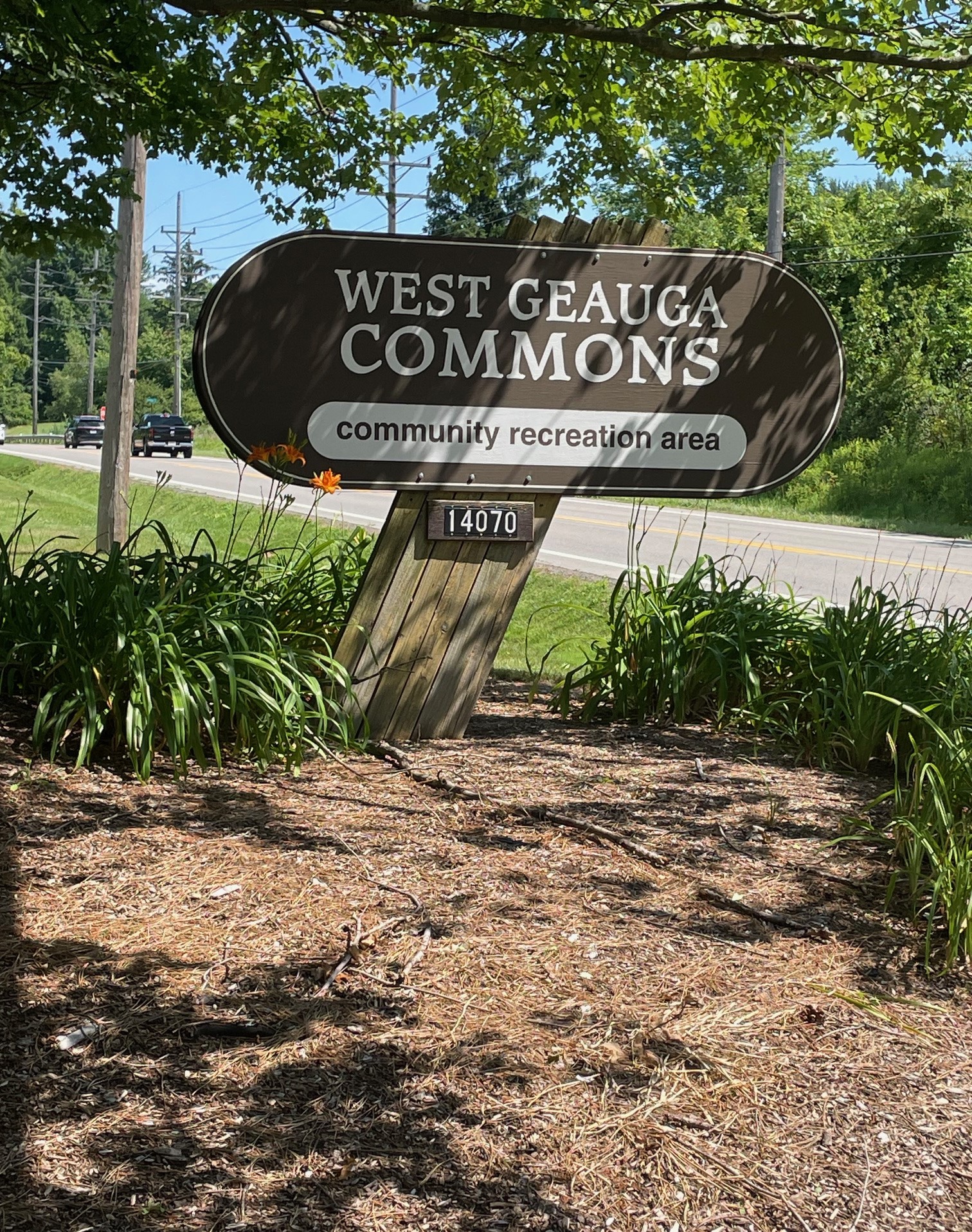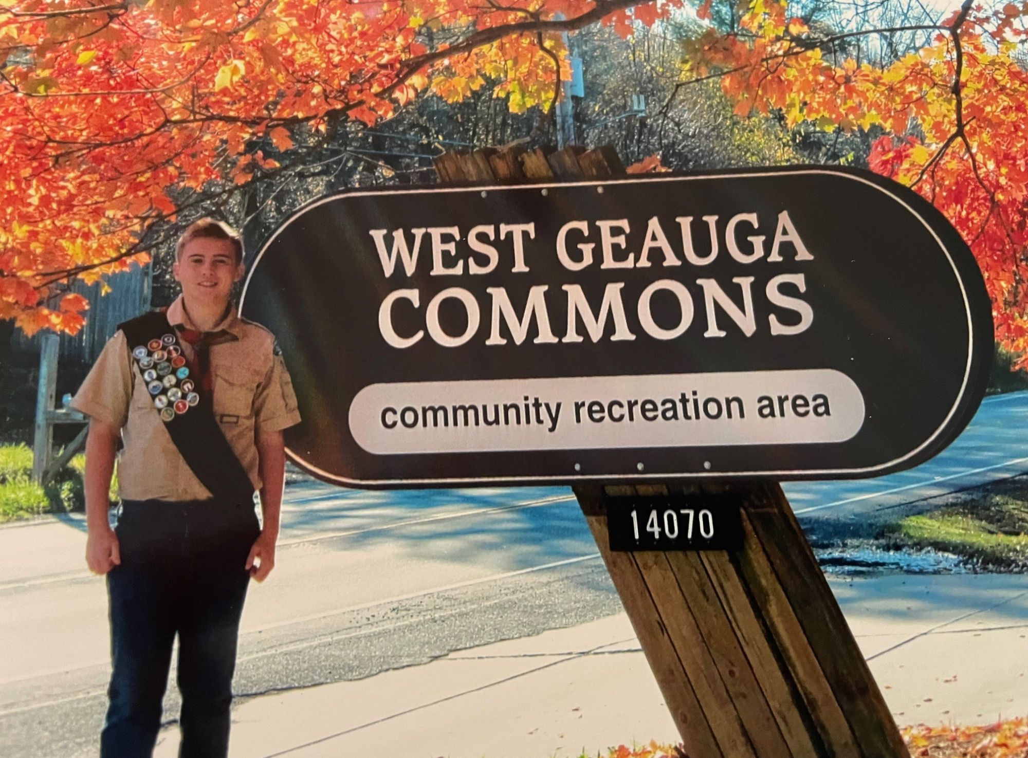 The original "West Geauga Commons" sign at the park entrance was replaced + a new sign. With our address (14070) was made by Xavier Zup as part of his Eagle Scout project.
